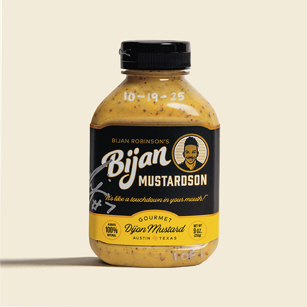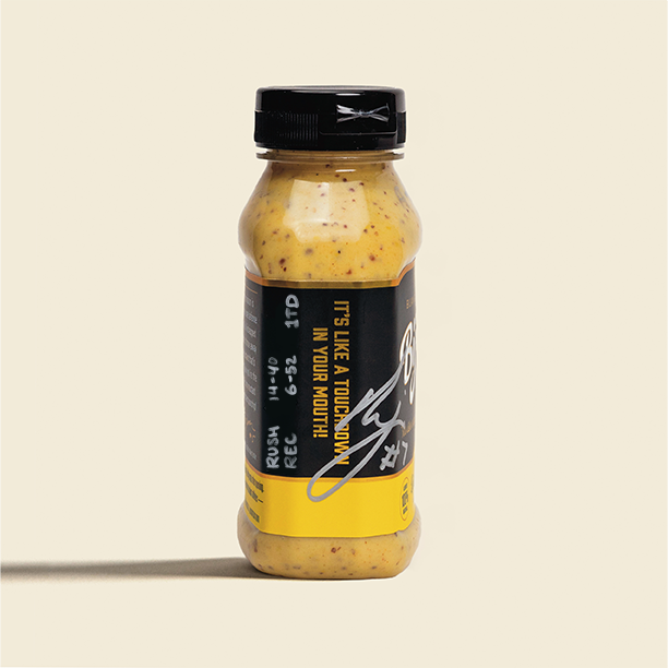 My 2025 Season Week 7 Game Bottle, complete with my stats, my autograph, and the date. Only 1 bottle available. Buy this 1-of-1 mustard-based collector’s item today!