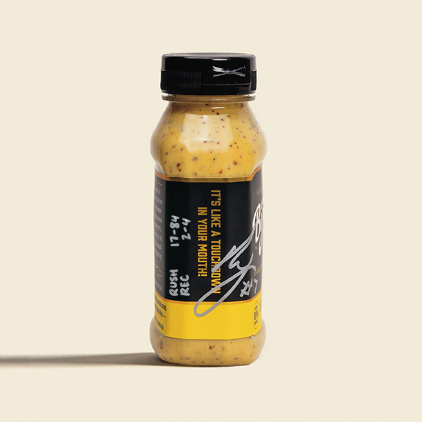 My 2025 Season Week 10 Game Bottle, complete with my stats, my autograph, and the date. Only 1 bottle available. Buy this 1-of-1 mustard-based collector’s item today!